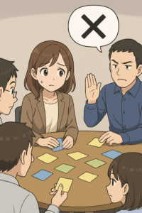 この思考は、いわゆる心理的安全性の低下を引き起こします。心理的安全性とは、メンバーが自由に意見を出せる雰囲気のことですが、これが失われると、誰も発言しなくなり、最終的には会議が一方的な発表の場になってしまいます。会議の意味半減ですね。
