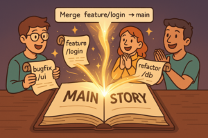 マージは、異なるブランチで行った変更を一つに統合するプロセスです。これは、複数のサブプロットを一つの大きな物語に統合することに似ています。各サブプロットで進行していたストーリーラインが一つにまとまることで、全体として一貫した物語が完成します。同様に、マージを行うことで、異なるブランチで行った変更が一つのリポジトリに統合されます。