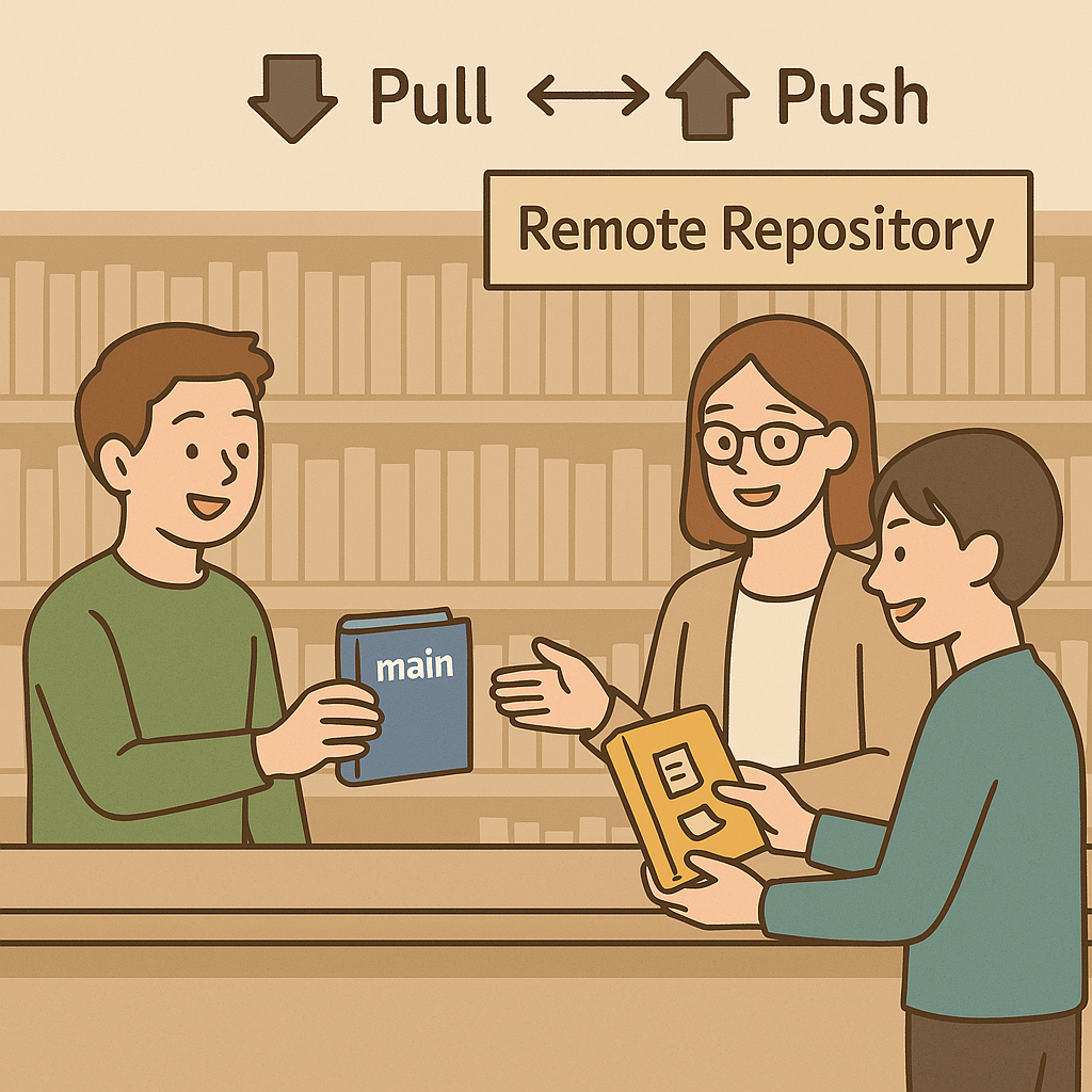 プル(Pull)とプッシュ(Push)は、リモートリポジトリとローカルリポジトリ間で変更をやり取りするコマンドです。これは、図書館から本を借りる(プル)ことと、借りた本に自分なりのメモを加えて返却する(プッシュ)ことに例えられます。プルコマンドで最新の変更を取り込み、プッシュコマンドで自分の変更を共有することで、チーム全体が最新の状態を維持できます。