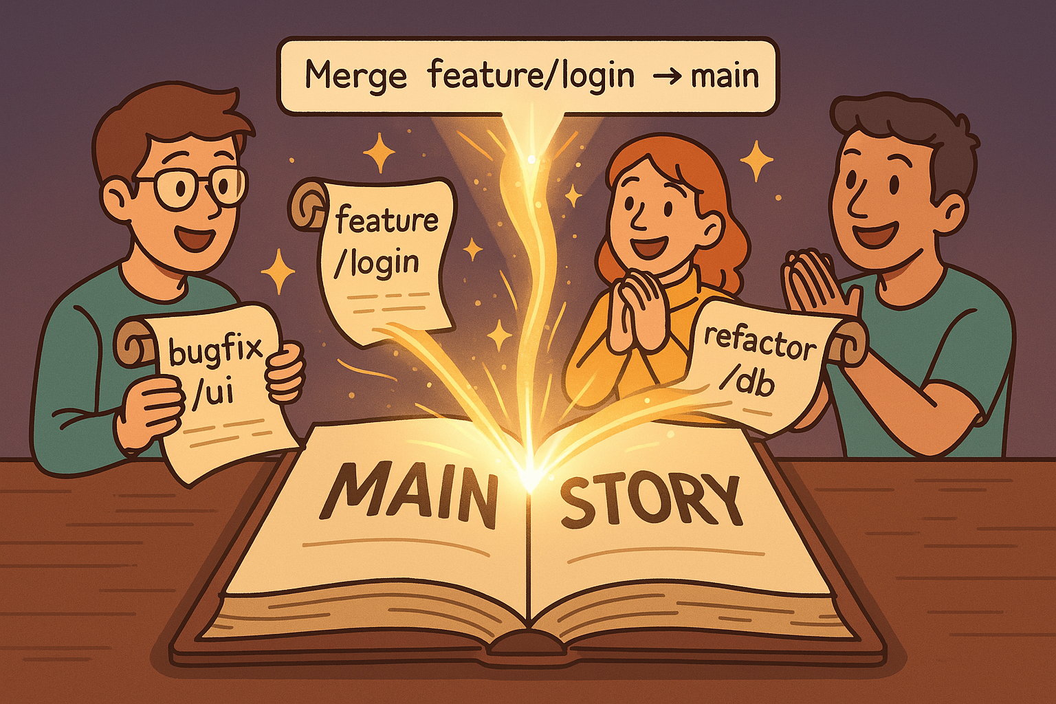 マージは、異なるブランチで行った変更を一つに統合するプロセスです。これは、複数のサブプロットを一つの大きな物語に統合することに似ています。各サブプロットで進行していたストーリーラインが一つにまとまることで、全体として一貫した物語が完成します。同様に、マージを行うことで、異なるブランチで行った変更が一つのリポジトリに統合されます。